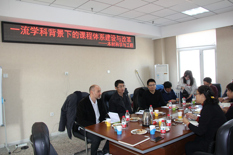 Michaud教授也介绍了本人主要从事的木质人造板、木塑复合材料、木材耐用性、复合材物理力学性能、木材热处理等方面的研究工作。专业与会教师也分别介绍了各自的研究方向,同时就中法两国共同面临的废弃木材回收利用、木材耐老化性能和新产品开发涉及的环保问题等方面,与Franck Michaud教授展开了深刻交流讨论。双方针对研究生及教师交流的途径、可能开展的合作项目等达成了共识。